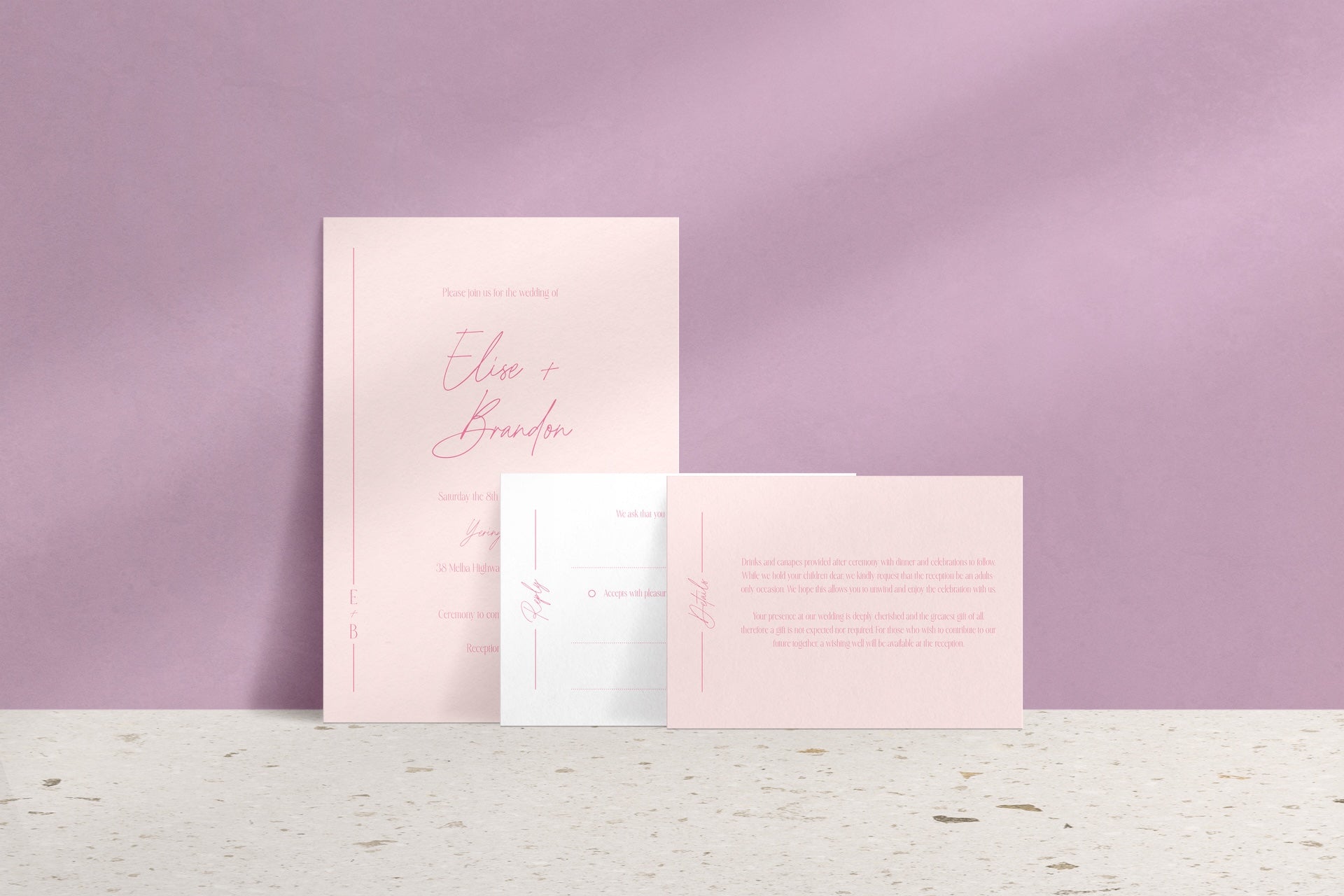 This suite includes your A5 invitation, A6 details card, A6 RSVP card, and optional matching envelope — with the flexibility to build the combination that suits you best. Choose the full suite for a complete coordinated set, or keep things simple with just the invitation and RSVP, or invitation and details card with envelope.