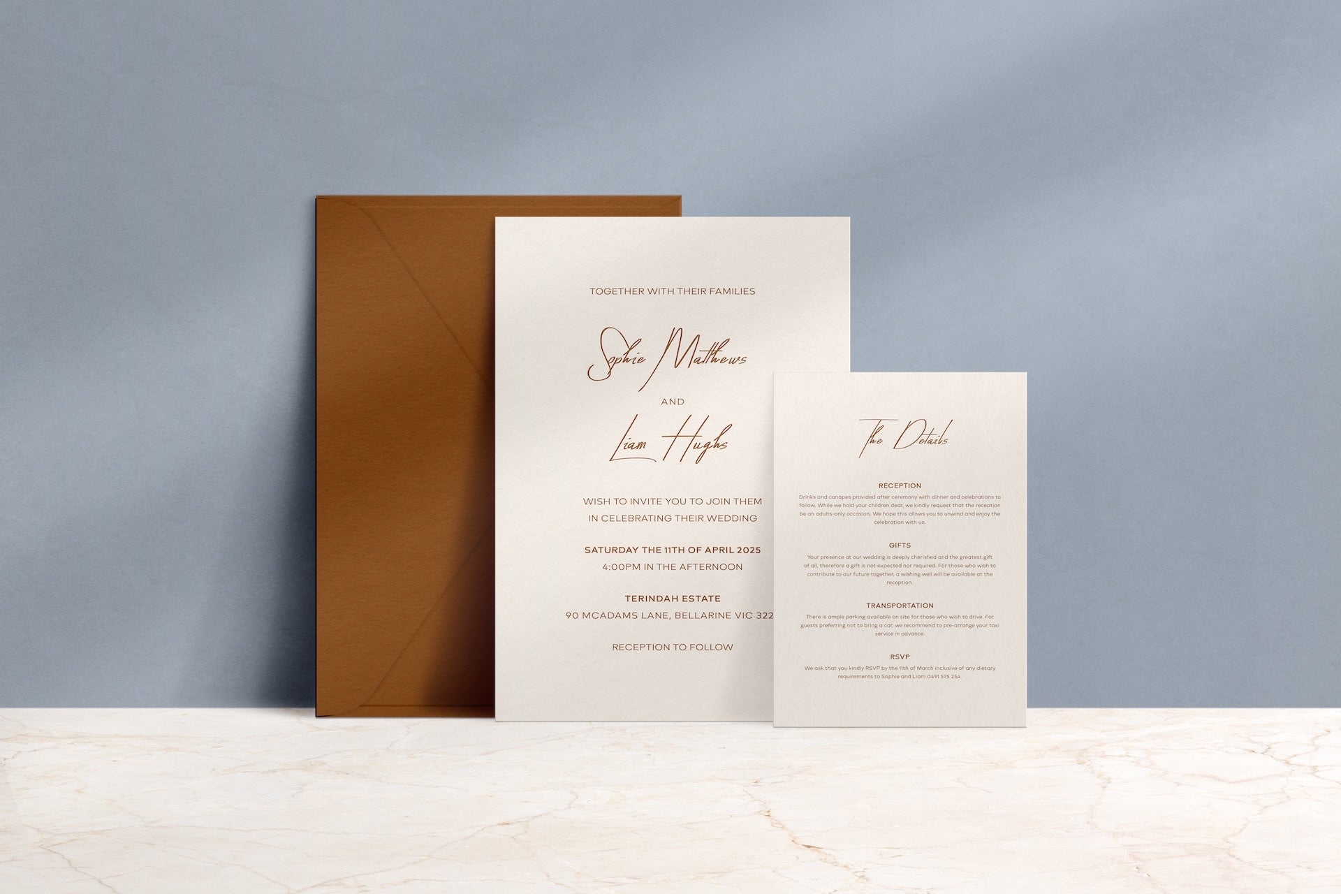 The Simply Said invitation suite is designed for couples who appreciate quiet detail and a sense of calm on the page. Your names are written in a flowing handwritten script, supported by clear, modern typography that guides guests through the essentials without crowding the design. The generous spacing and gentle hierarchy create an invitation that feels composed, elegant and effortlessly modern.