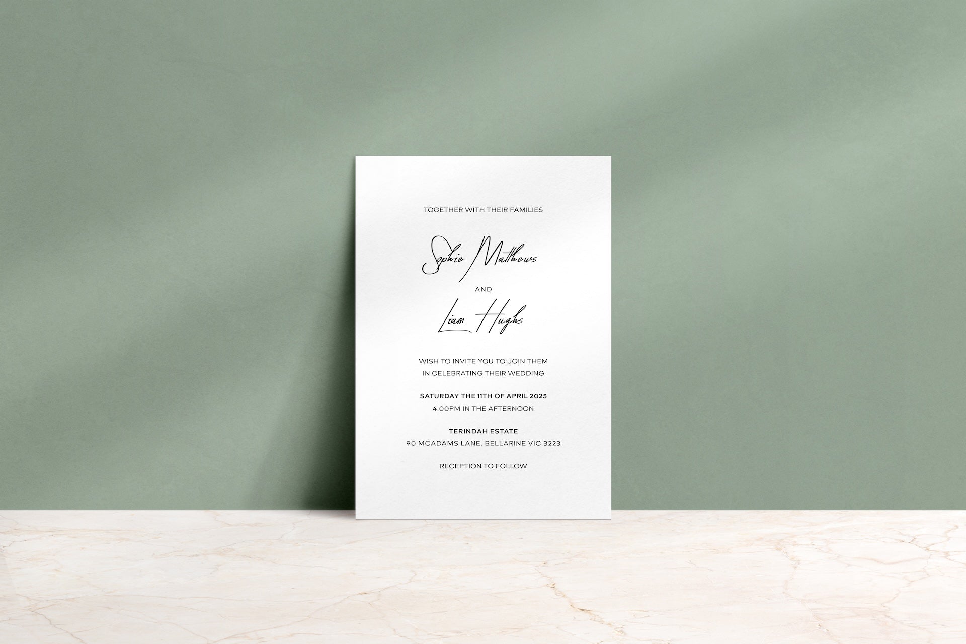 The Simply Said invitation suite is designed for couples who appreciate quiet detail and a sense of calm on the page. Your names are written in a flowing handwritten script, supported by clear, modern typography that guides guests through the essentials without crowding the design. The generous spacing and gentle hierarchy create an invitation that feels composed, elegant and effortlessly modern.